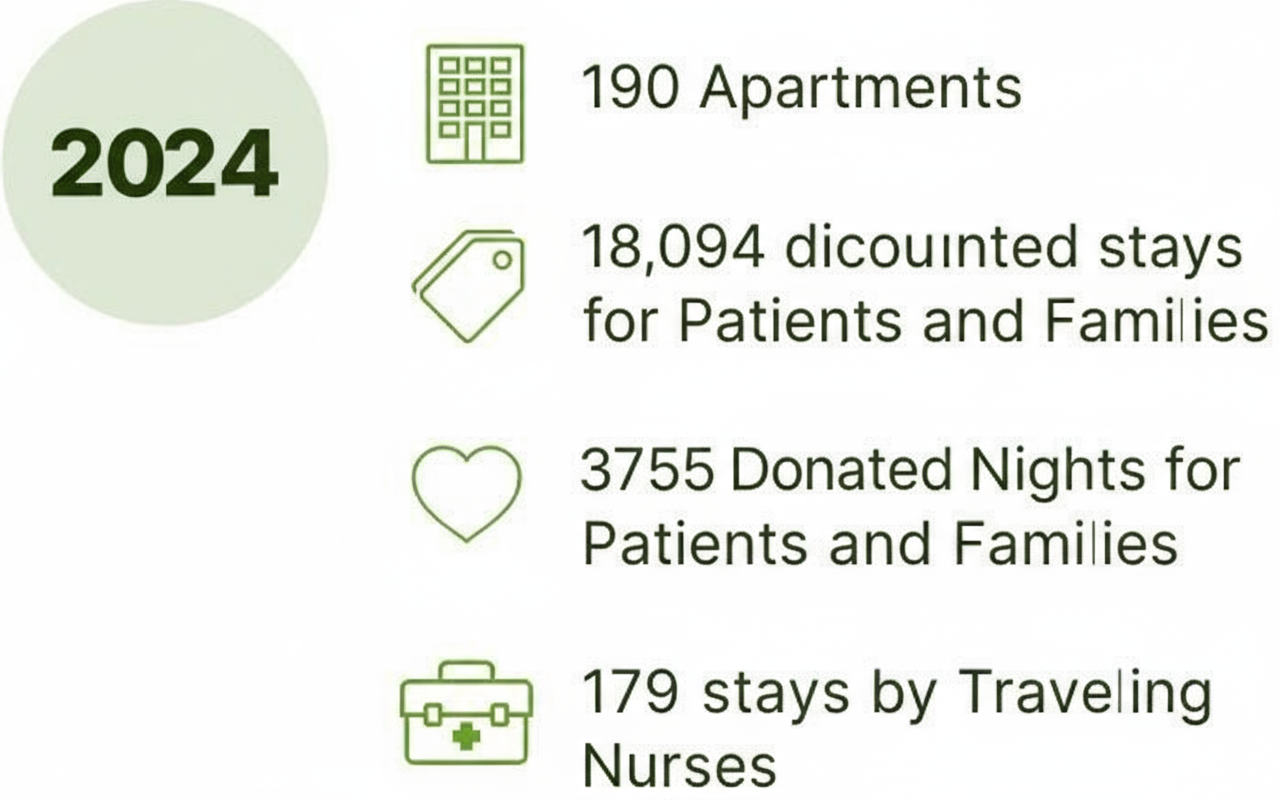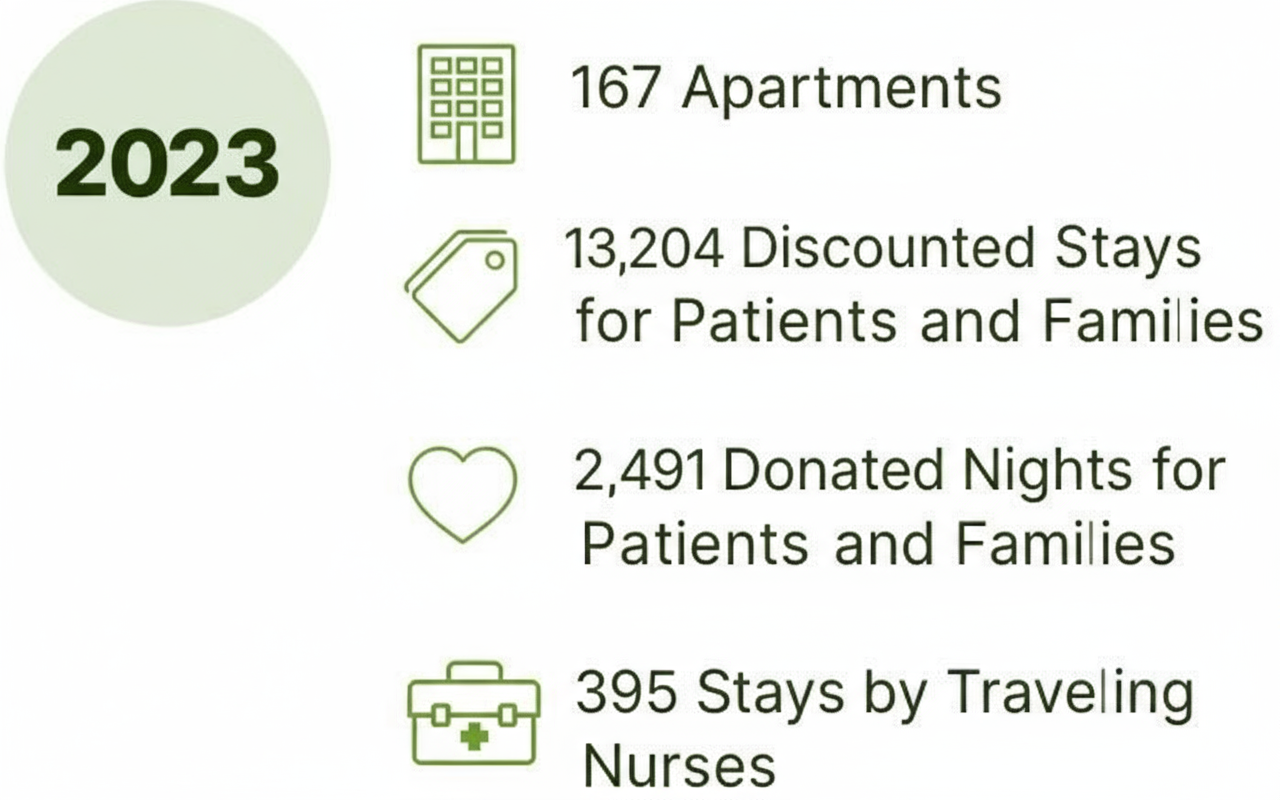 We offer furnished housing for traveling professionals, relocation companies, and even corporate stays as well. Our non-medical stays help to subsidize the costs for families that may not be able to afford Boston’s steep hotel prices, and also help us to donate entire apartments for our non-profit partners.