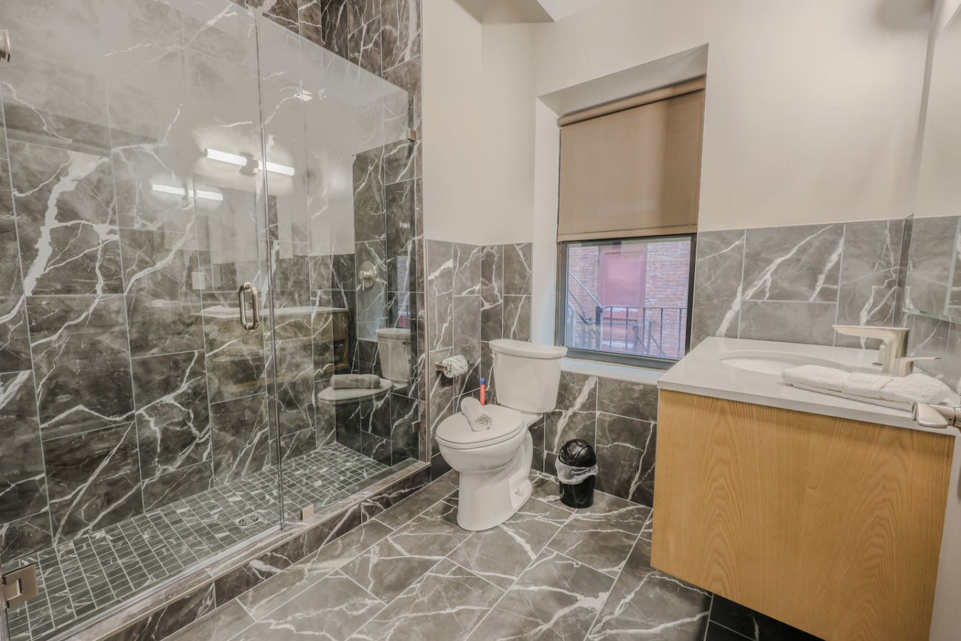 The building has an ADA compliant entrance, two elevators, two staircases, plenty of storage for trash, and even an Amazon Locker where you can send packages.
