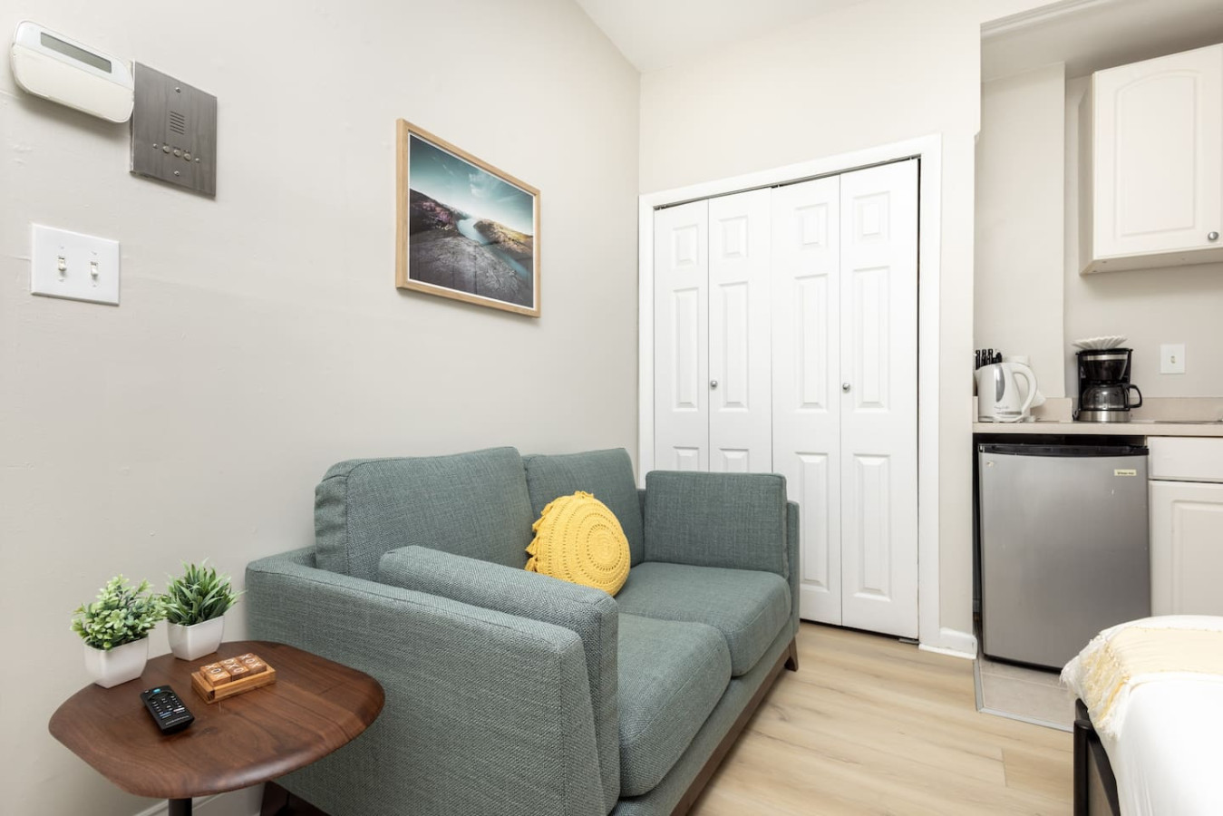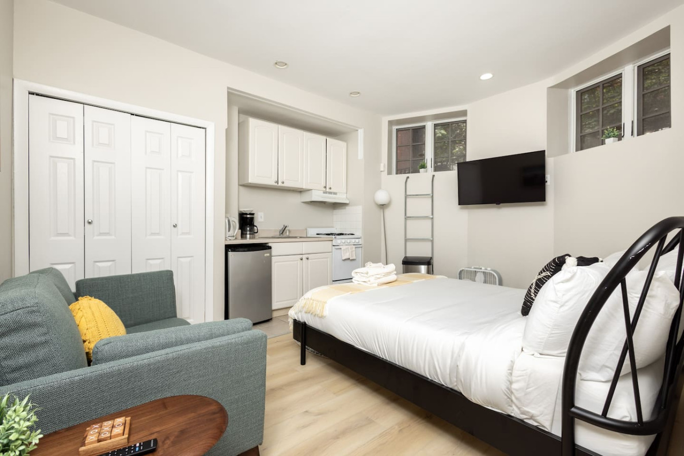 Our heating system has one thermostat for the entire apartment building, which just means you can crack a window if it gets too hot on the upper floors. We have an on-call employee that lives nearby who can help during normal business hours, and a 24/7 guest messaging team to support.