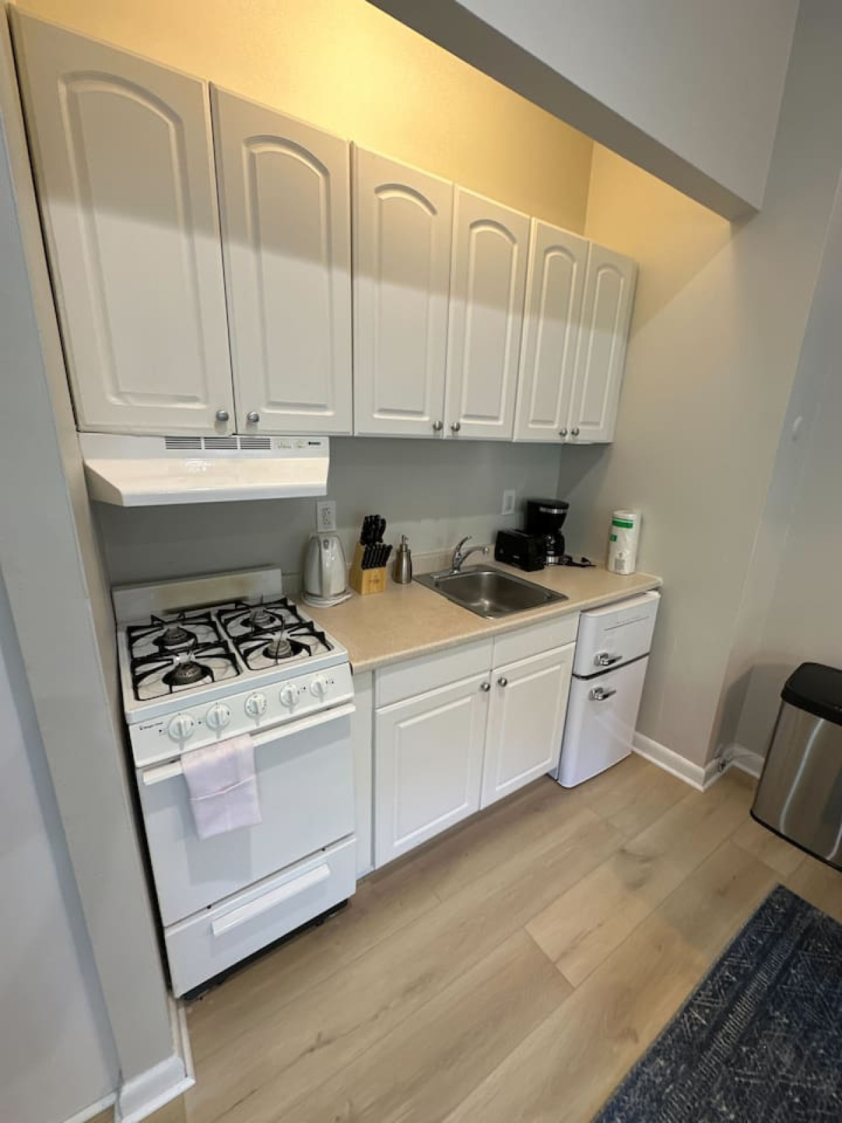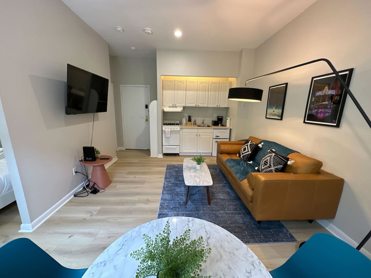 Everything you need and nothing you don't. Our motto is to provide fairly priced furnished apartments in great locations. The location will make up for the cramped space, but I think you'll find that once you settle in, you don't always need a ton of space! This unit is unique because it has a long hallway once you enter the apartment and the space is located in the back of the building so it should be super quiet.