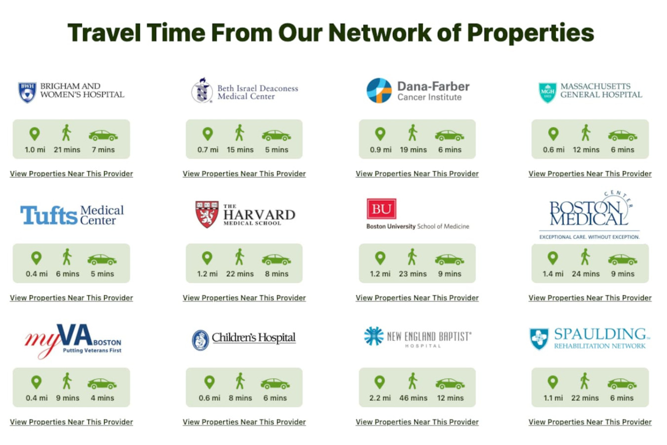 Boston is one of the most walkable cities, and this location really ideal in that its pretty much in the middle of everything. As a provider of short-term medical stays for patients and longer term stays for travel nurses, the location couldn't be more accessible to our top hospitals.
