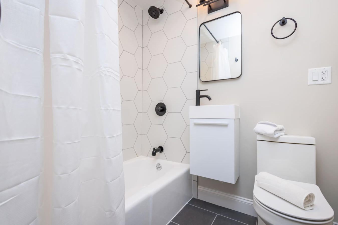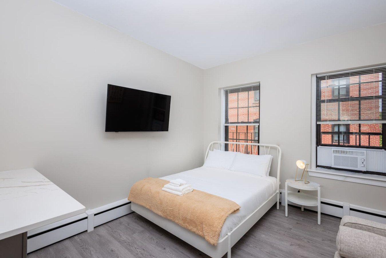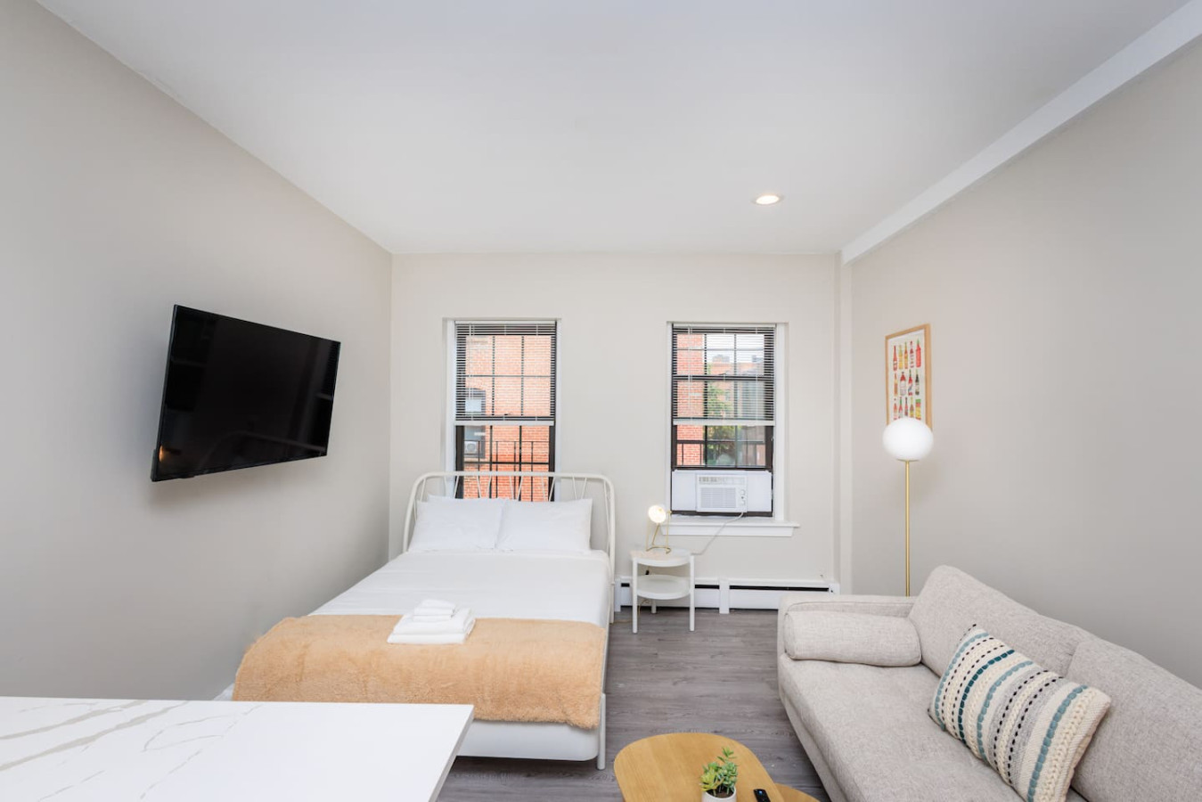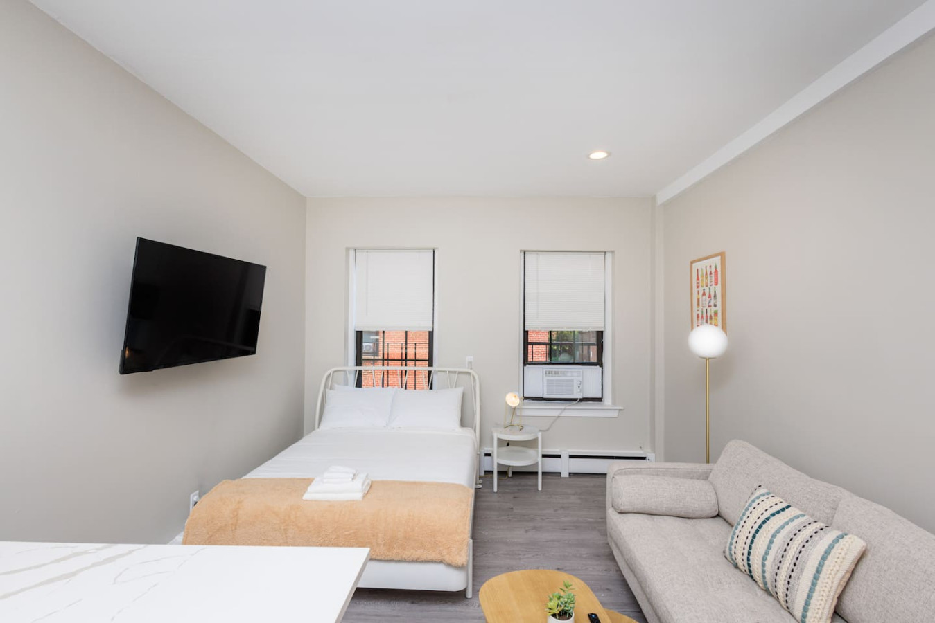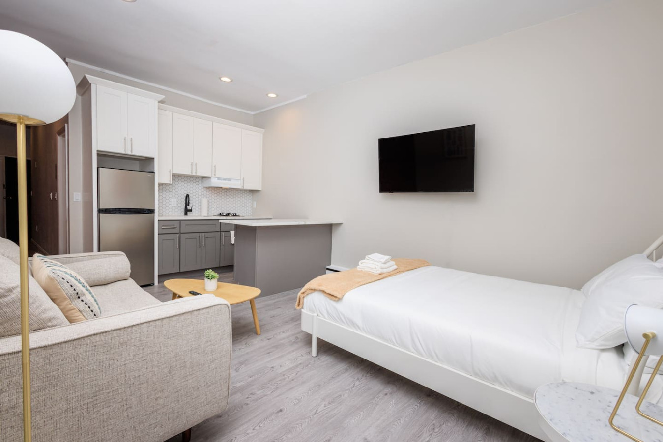 Everything you need and nothing you don't. Our motto is to provide fairly priced furnished apartments in great locations. The location will make up for the cramped space, but I think you'll find that once you settle in, you don't always need a ton of space! This unit is unique because it has a long hallway once you enter the apartment and the space is located in the back of the building so it should be super quiet.