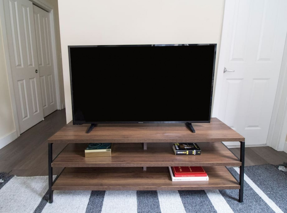 The sofa and TV are located in the bedroom, but the dining area is in a separate room with the kitchen.