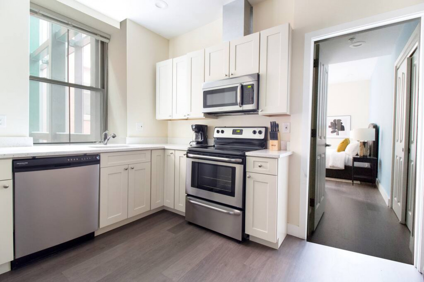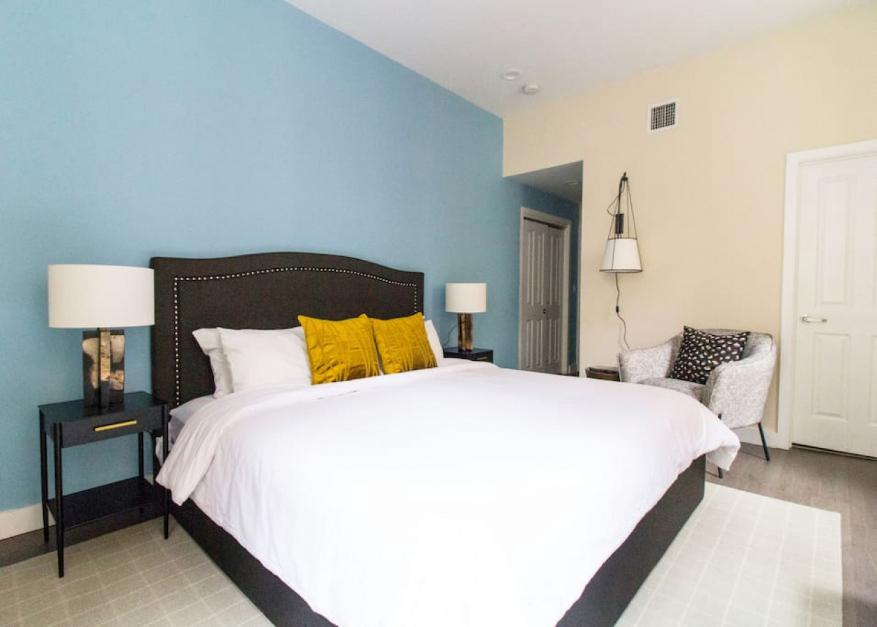This 1 bedroom apartment is pretty unique. It's half hotel room, half studio half 1 bedroom. It has a full kitchen and dining area separate from the bedroom, so you're not cooking in your sleeping space. But there's no living area or sofa. Great for a short stay or a business meeting. Not ideal for
