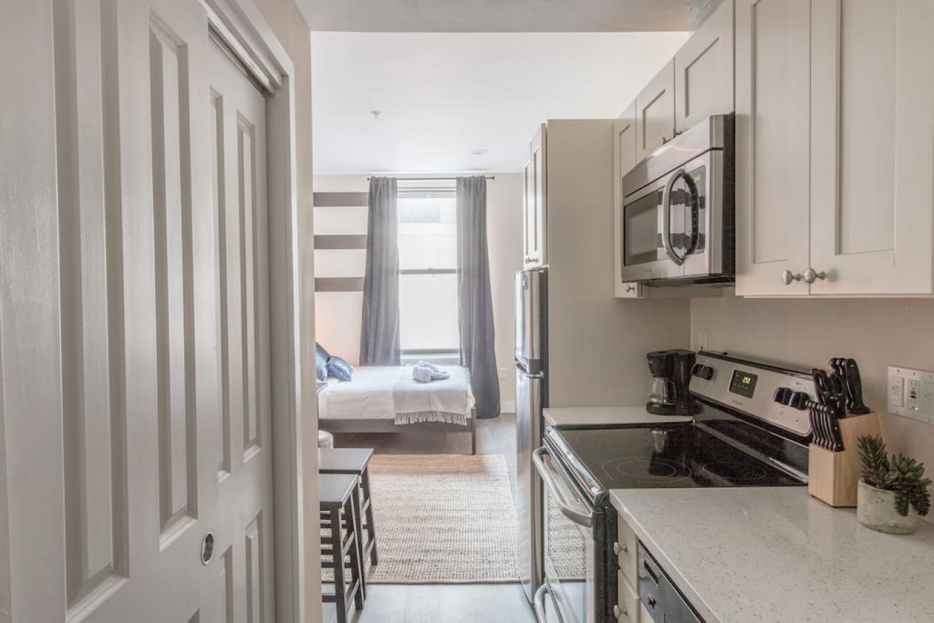 This studio apartment with washer dryer in building is located in the heart of Boston, just a 3 minute walk to Public Transportation. It is designed with simple modern style and has everything you need for a short stay with the comforts of home. Fully stocked kitchen has everything you'd need to cook a basic meal. The ...